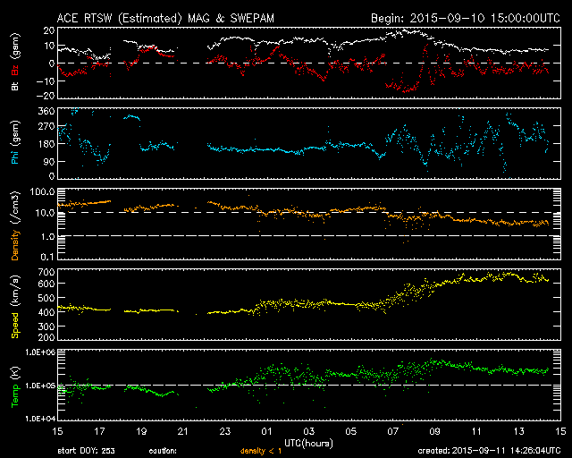 This morning, due to the influence of a high-speed solar wind stream from a large coronal hole, geomagnetic storm conditions were observed when the interplanetary magnetic field (IMF) within the solar wind slipped strongly southwards.