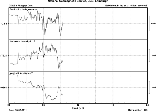 Having taken 3 days to travel from the Sun to the Earth, the interplanetary shock wave created a sudden impulse in the geomagnetic field known as a Storm Sudden Commencement (SSC). This was recorded at the BGS UK magnetic observatories and simultaneously at observatories around the world. At Eskdalemuir in the Scottish Borders the horizontal strength of the magnetic field changed suddenly by 27nT.
