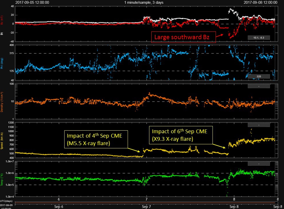 The coronal mass ejection from the 6th September, associated with the X9.3 solar flare, arrived earlier than expected, overnight on 7th/8th September. The impact on the Earth's magnetosphere was recorded at BGS's magnetic observatories. The magnetic field began to strengthen from 23:00 UT (00:00 BST). Geomagnetic activity was high. Globally this reached a peak of Kp=8 STORM G4 levels which sustained for around 6 hours.