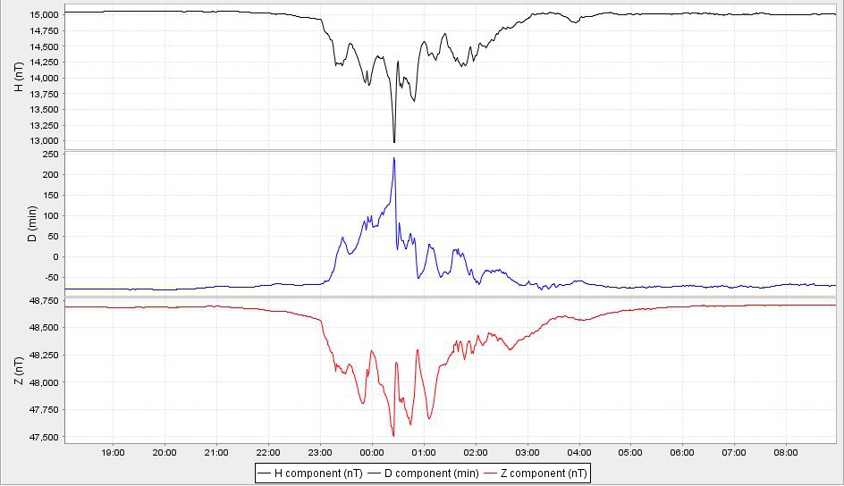 In the UK geomagnetic activity was greatest at our most northern observatory in Lerwick, Shetland Isles. The local K reached K=9, STORM G5 levels, which is the highest value in this activity scale. The field also varied rapidly - at one point the compass direction (declination) swung by more than 3 degrees in 2 minutes!