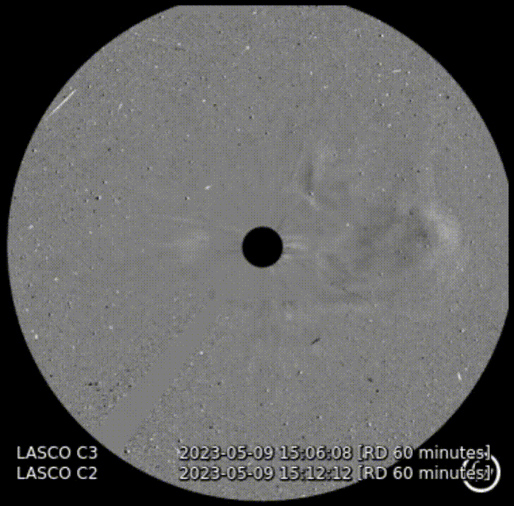 The Coronal Mass Ejection (CME) that lifted off the Sun on 9th May arrived at the Earth's magnetosphere at 6:30 UT on 12th May with activity reaching STORM G1 levels briefly on arrival. See NOAA space weather scales for more details about these storm levels.