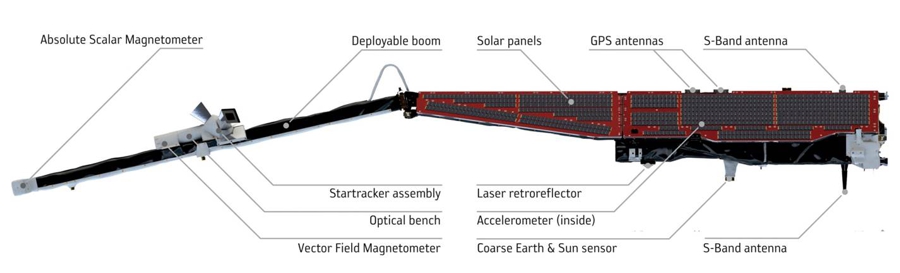 Each satellite is nine metres long, which a main body covered in solar panels and a four metre boom on which the sensitive magnetic field measuring instruments sit - away from electrical and magnetic interference. The magnetic field is measured by two instruments - (1) by the scalar instrument at the end of the boom which measures the strength of the field and (2) the vector instrument in the middle of the boom, which measures the direction of the field, using star cameras for accurate orientation of the satellite.