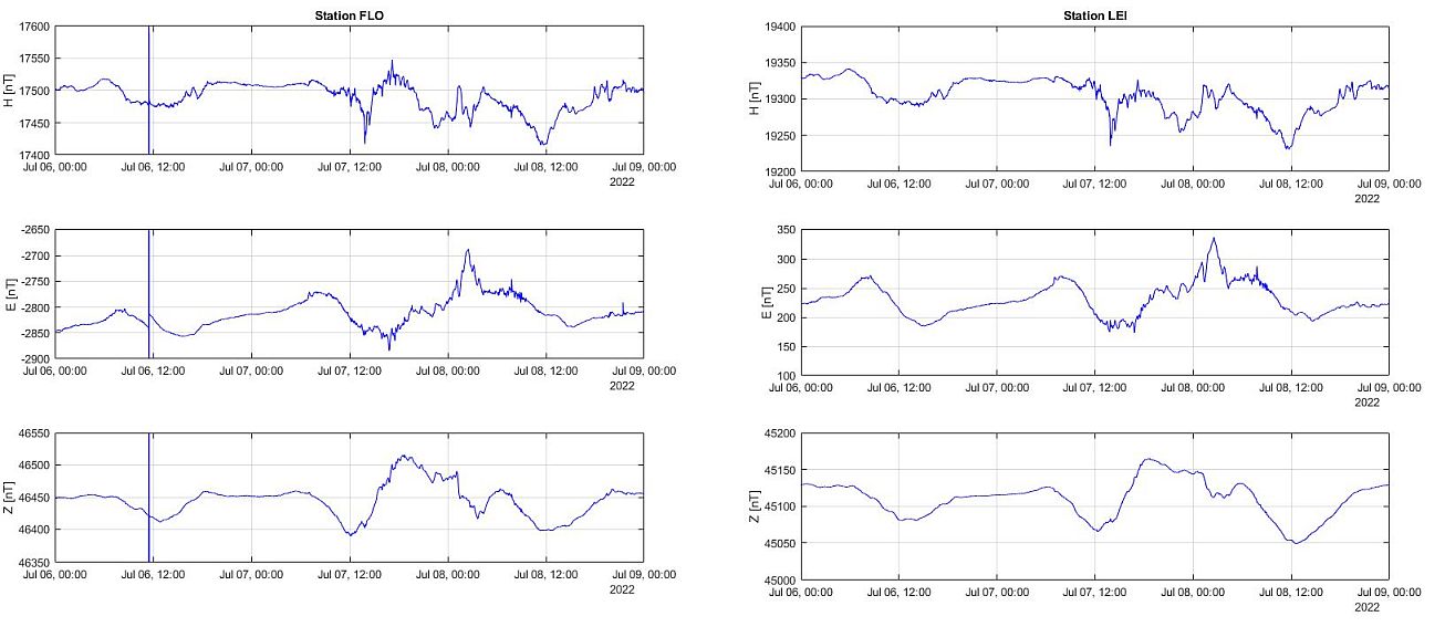 As an example of data quality, we show the comparison FLO and LEI for a minor storm on the 7/8th July 2022. The figure shows the horizontal intensity in the approximately magnetic North component (H), the intensity in the East component (E) and the variation in the vertical component (Z) for FLO and LEI for a quiet period (midnight on the 6th to midday on the 7th) before a period of minor geomagnetic activity (midday on the 7th to midnight on the 8th). FLO has a large spike before 12:00 which is likely artificial (e.g. someone or something stood on or near the sensor). Both systems have similar patterns over the three days which is very encouraging. They differ in detail though, which is to be expected as they are around 500 km apart.